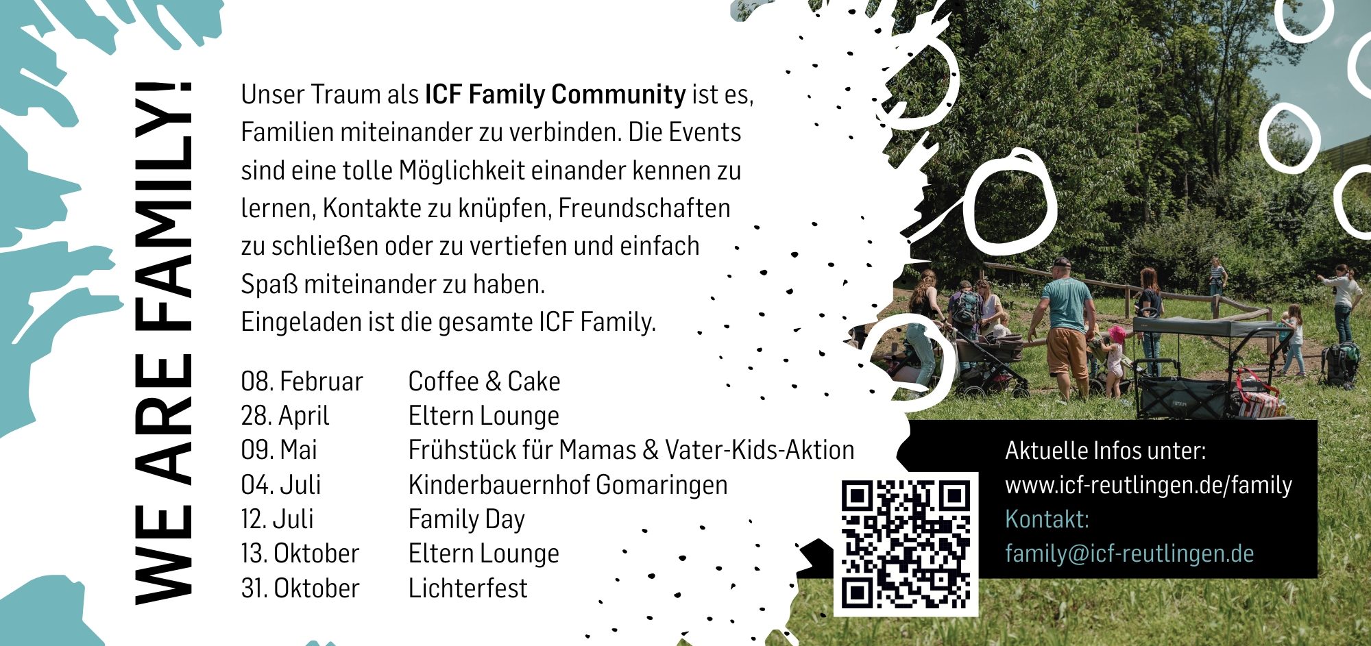 Unsere Events sind eine tolle Möglichkeit für Familien, (Ehe-)Paare und Alleinerziehende mit Kindern, einander kennen zu lernen, Kontakte zu knüpfen und Spaß miteinander zu haben. Wir ermutigen Eltern Gott in den Mittelpunkt ihres Ehe- und Familienlebens zu stellen, damit sie und ihre Kinder aufblühen und ihren Glauben an Gott auf eine positive, natürliche, ansteckende Art leben können. Neuen Familien wünschen wir dass sie schnell Anschluss finden!